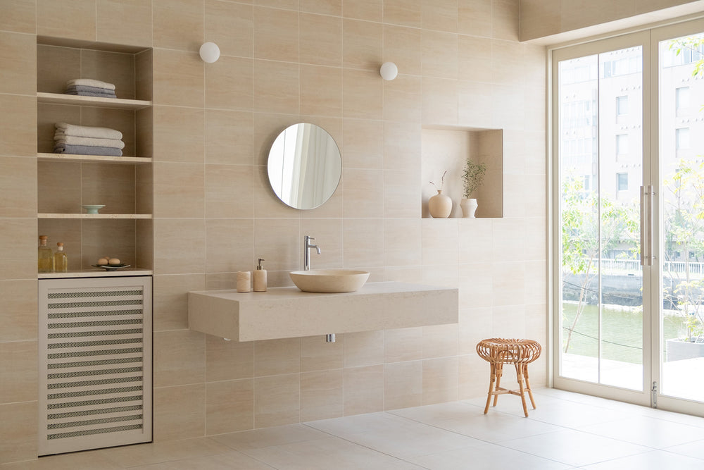 Tanは、ナチュラルな素材感と緑豊かな庭や運河の眺望が特徴です。石・木材・タイル・金属といった異なる質感を組み合わせ、シンプルな中に温かみを感じさせる空間を実現。特に広々とした洗面バスルームは、美容商品やライフスタイル撮影に適しています。