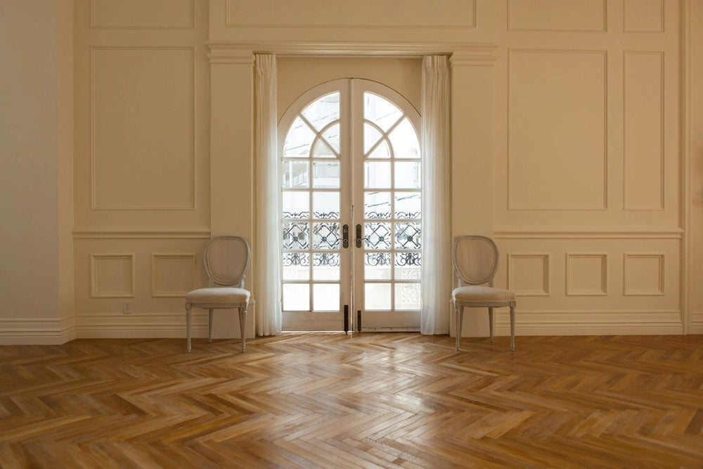 大きな5連窓から優しい自然光が差し込む、開放感あふれる撮影スタジオです。白い壁とヘリンボーンの床がクラシカルで上品な雰囲気を演出し、スチール・ムービー問わず幅広い撮影に対応します。