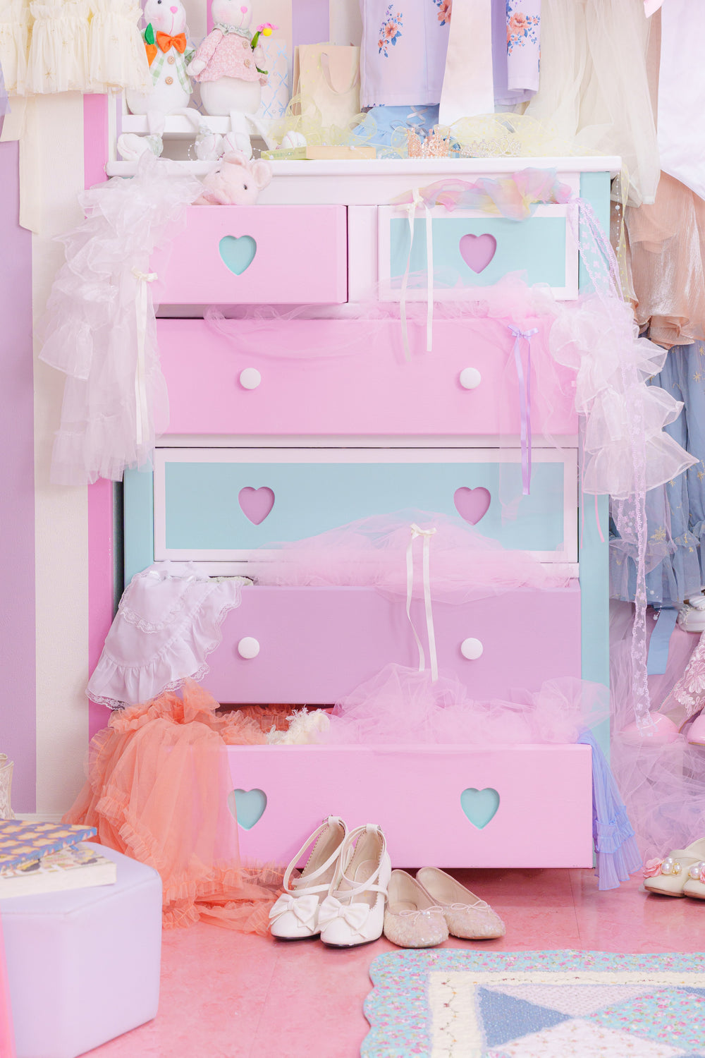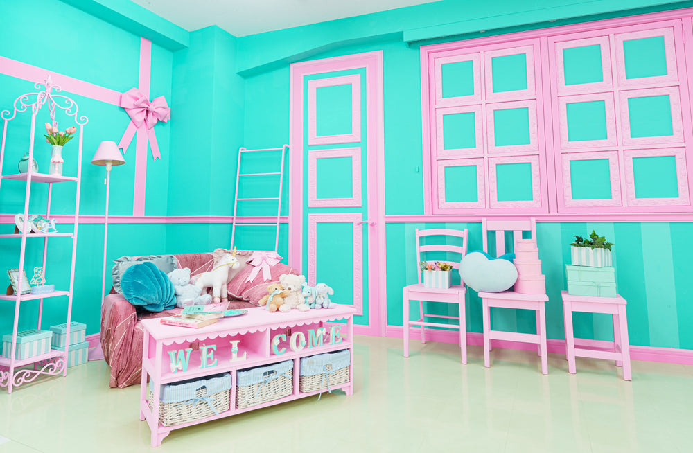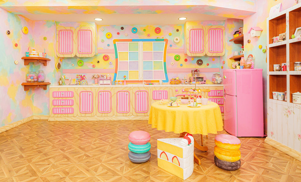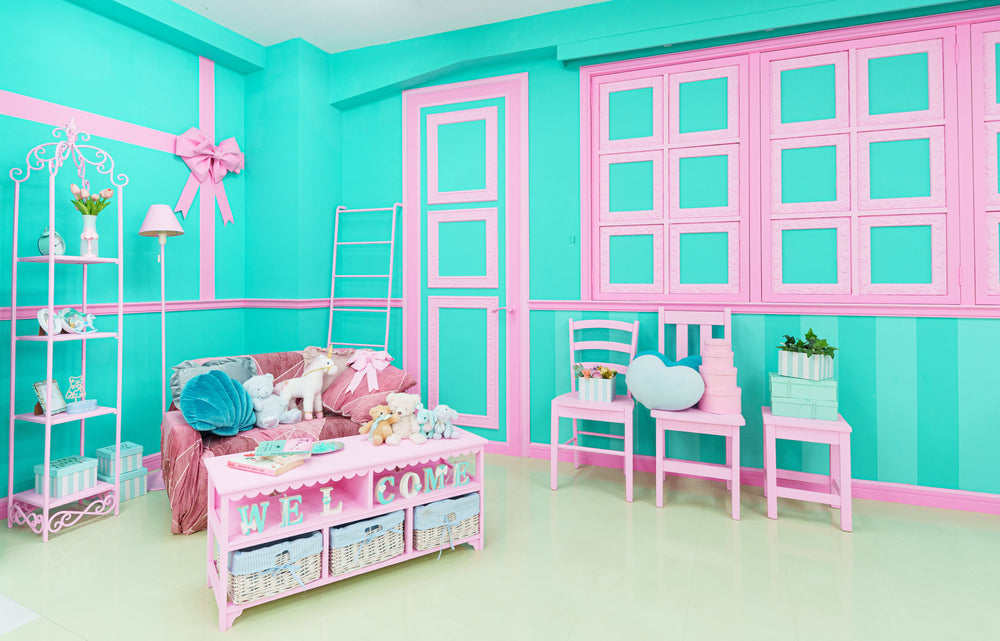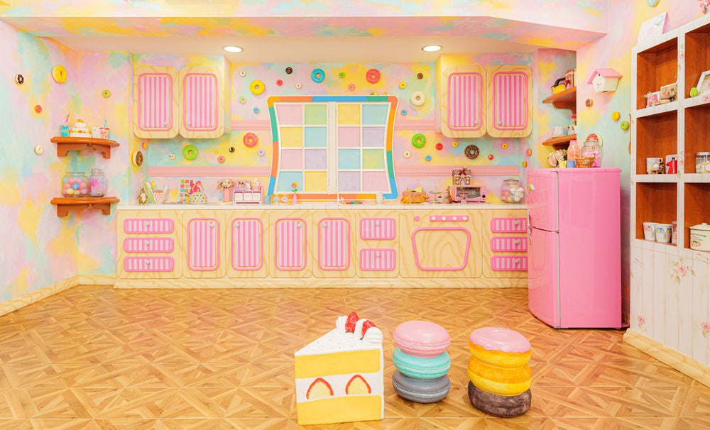 スタジオ内には壁ごとに異なるパステルカラーが施された4つの個性的なブースがあり、コスプレ撮影やポートレート、メルヘンやロリータ系のスタイリッシュな写真撮影にぴったりです。キッチン設備も備わっていますが、実際の使用はできないダミー仕様となっています。