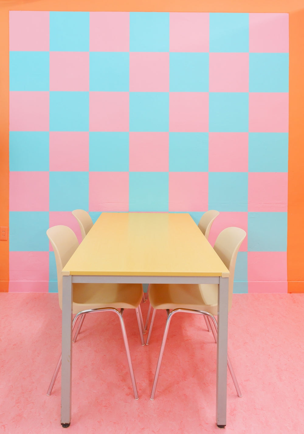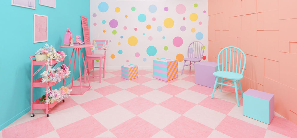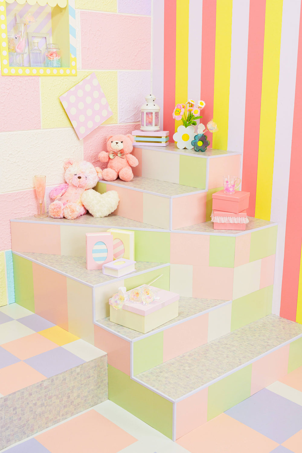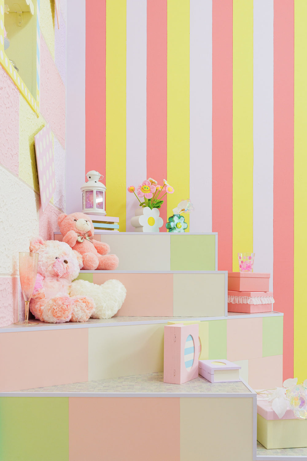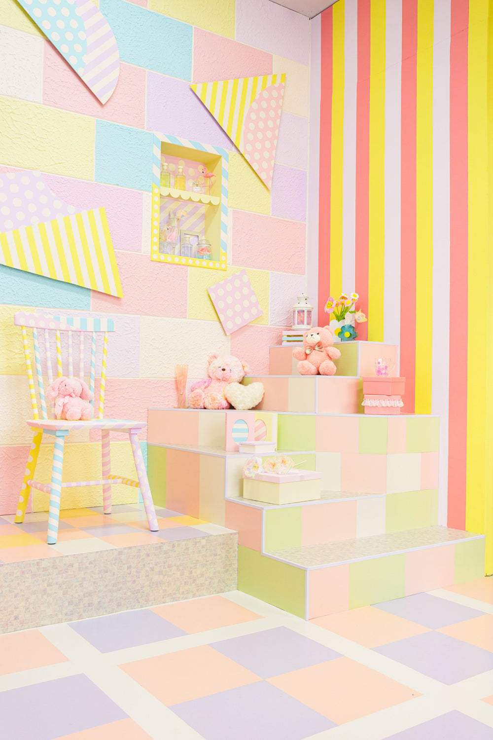 デザイン違いの壁にポップなカラーが映えるキュートなスタジオとなっており、ポップな7色に塗り分けられたカラフルな壁が印象的です。カラフルな床も含めインパクトのある空間に背景の色に馴染むカラーの椅子と机も用意がございます。