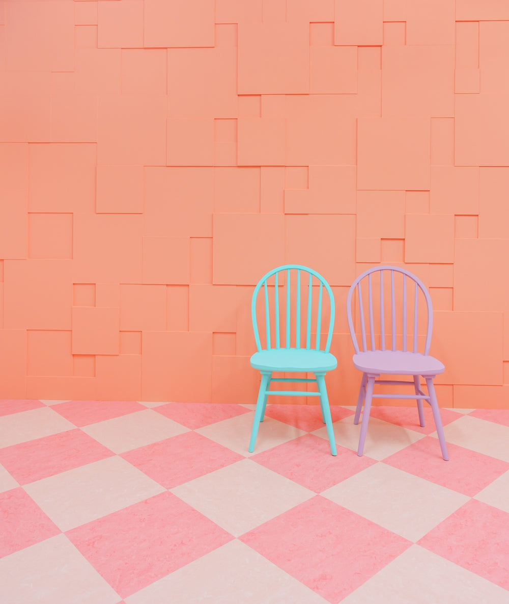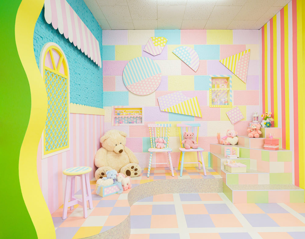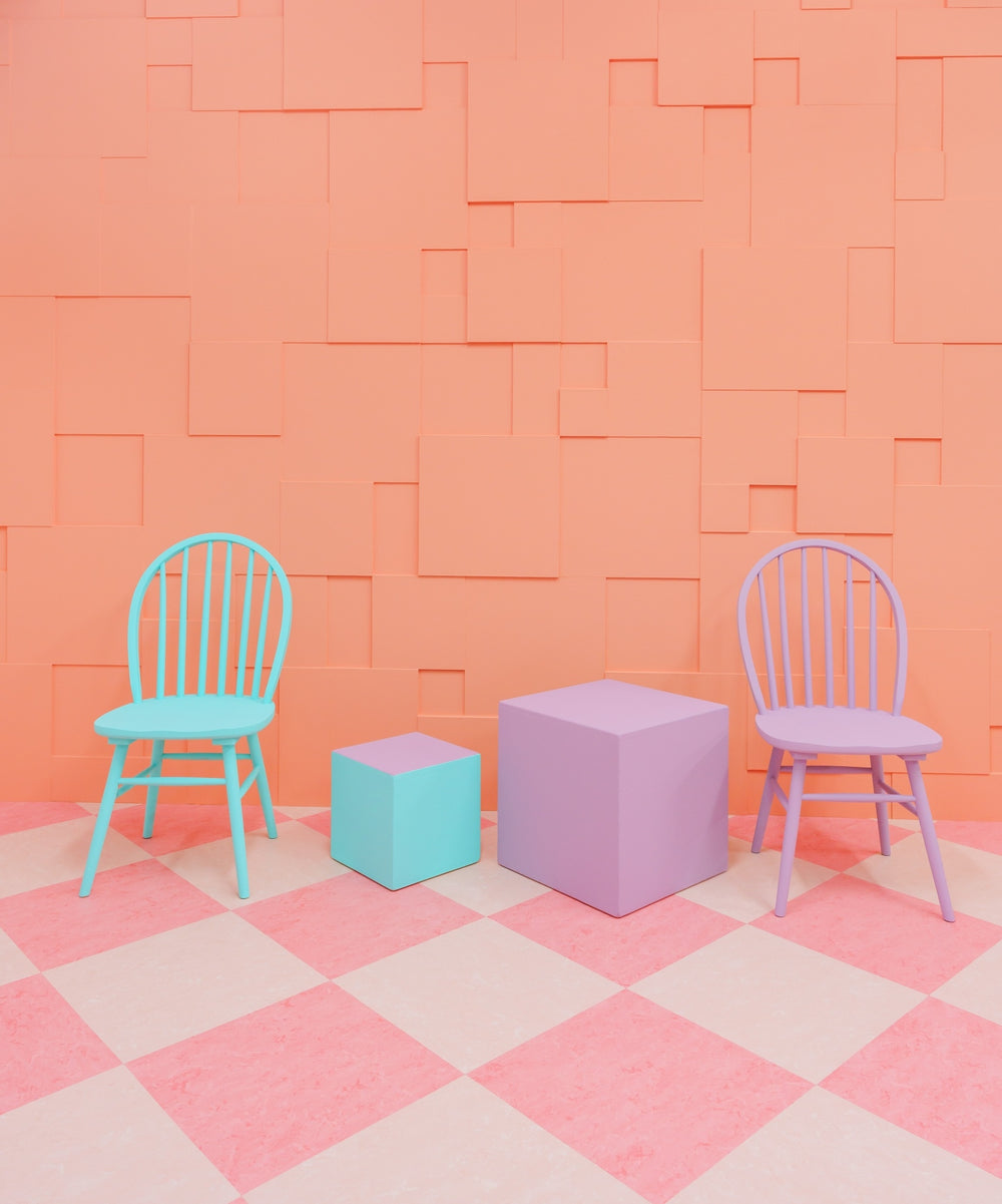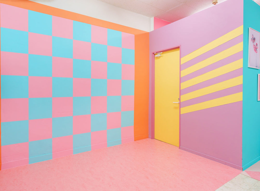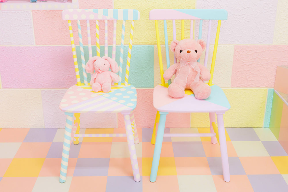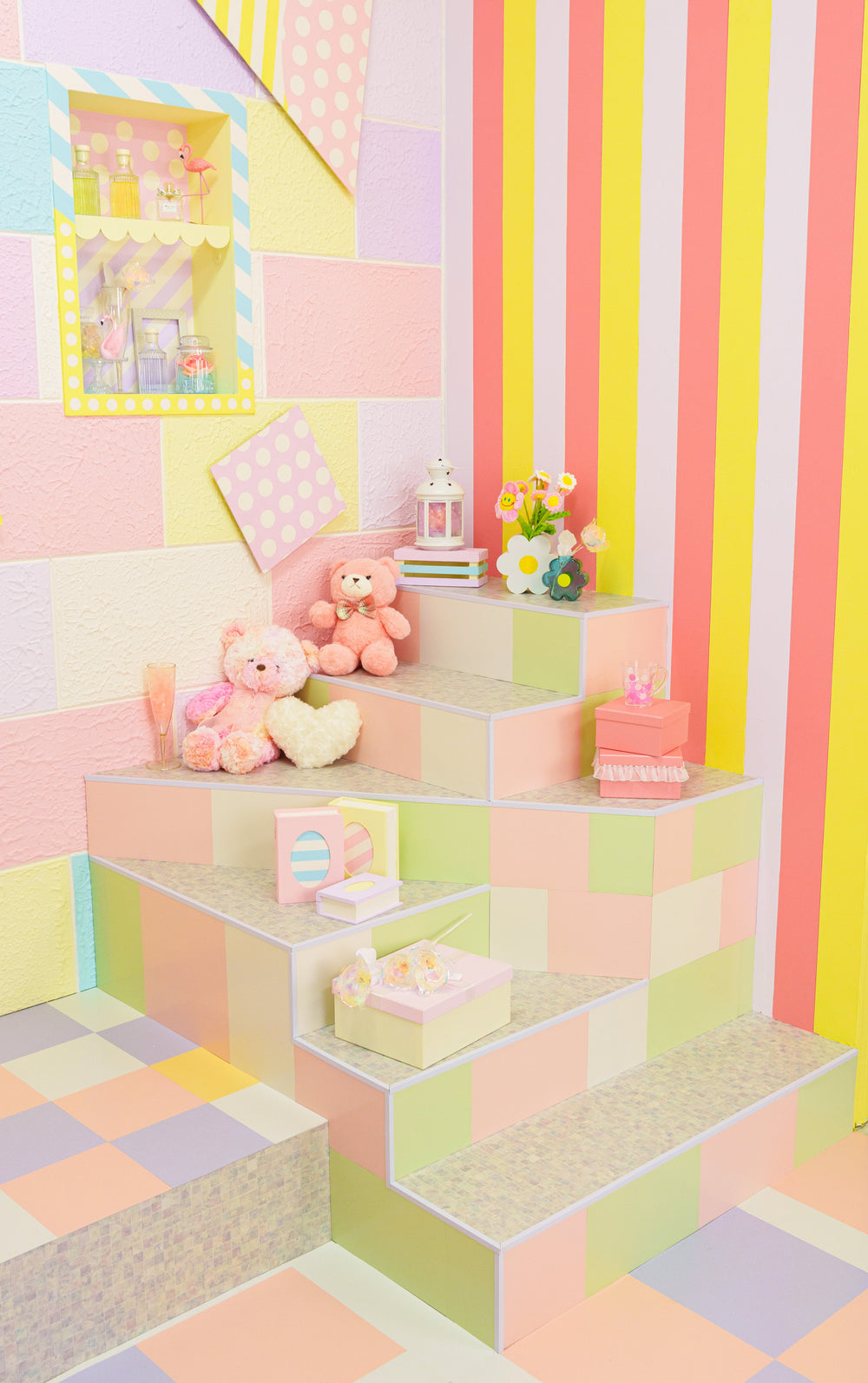 デザイン違いの壁にポップなカラーが映えるキュートなスタジオとなっており、ポップな7色に塗り分けられたカラフルな壁が印象的です。カラフルな床も含めインパクトのある空間に背景の色に馴染むカラーの椅子と机も用意がございます。