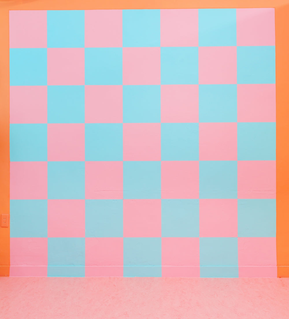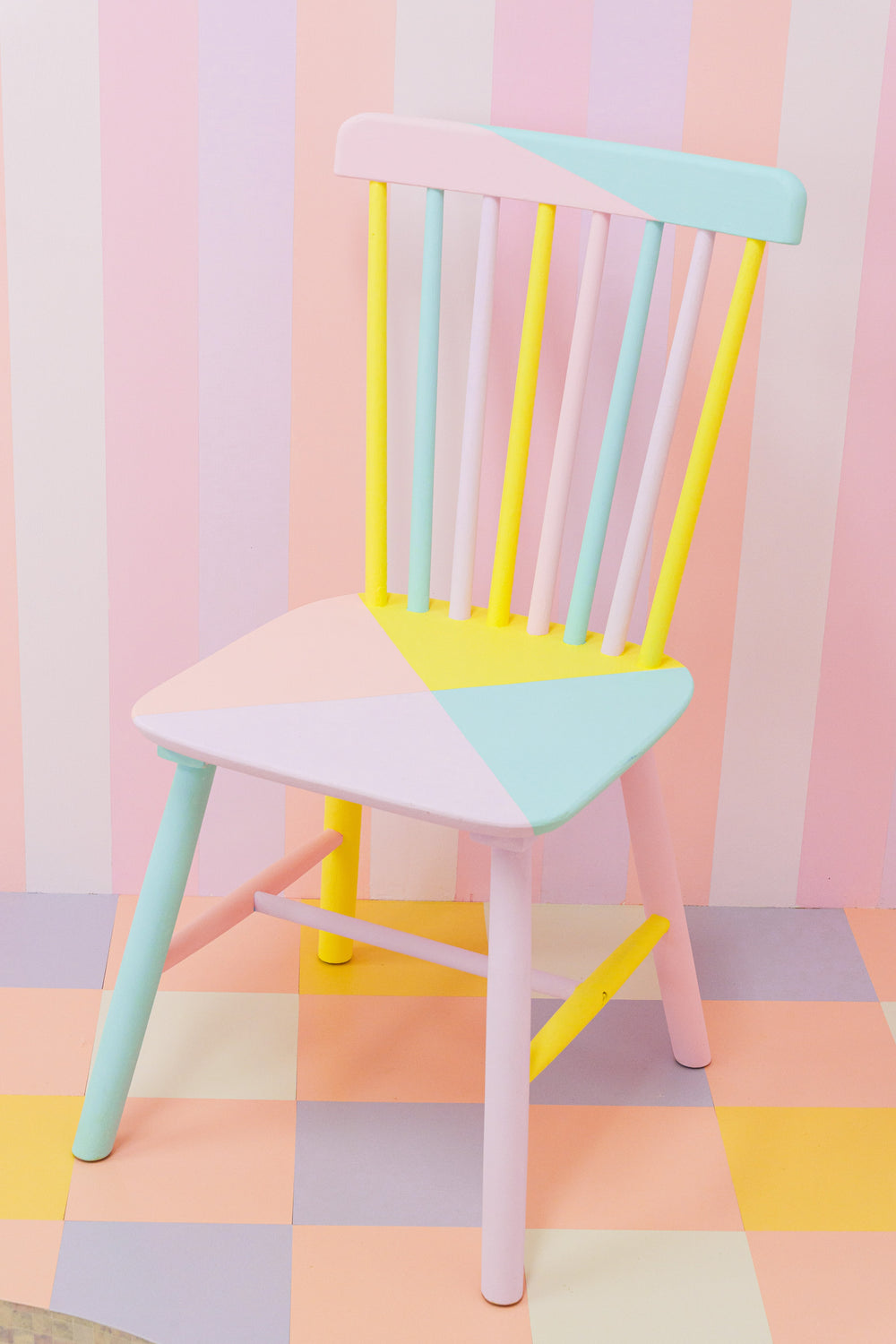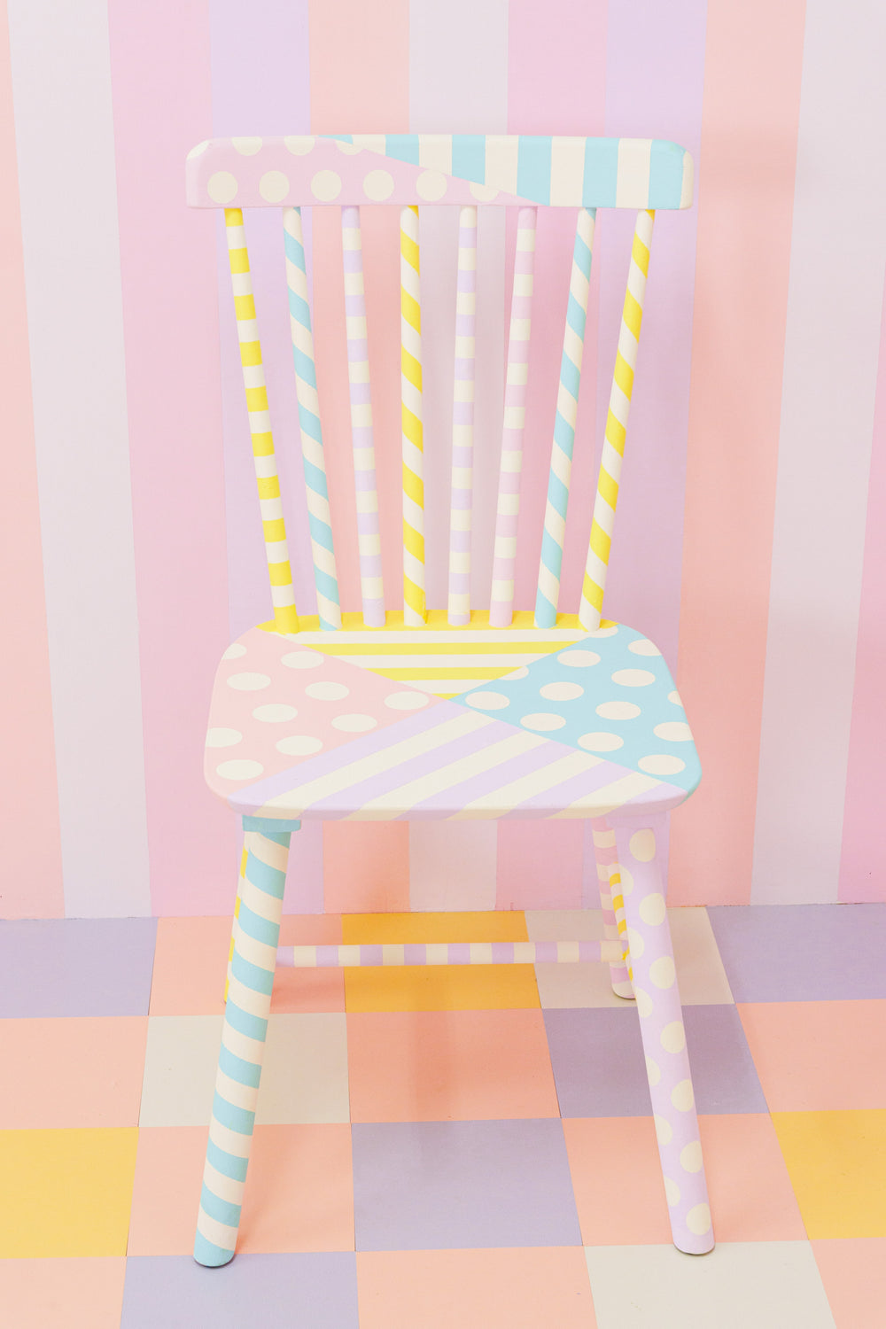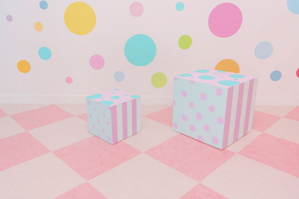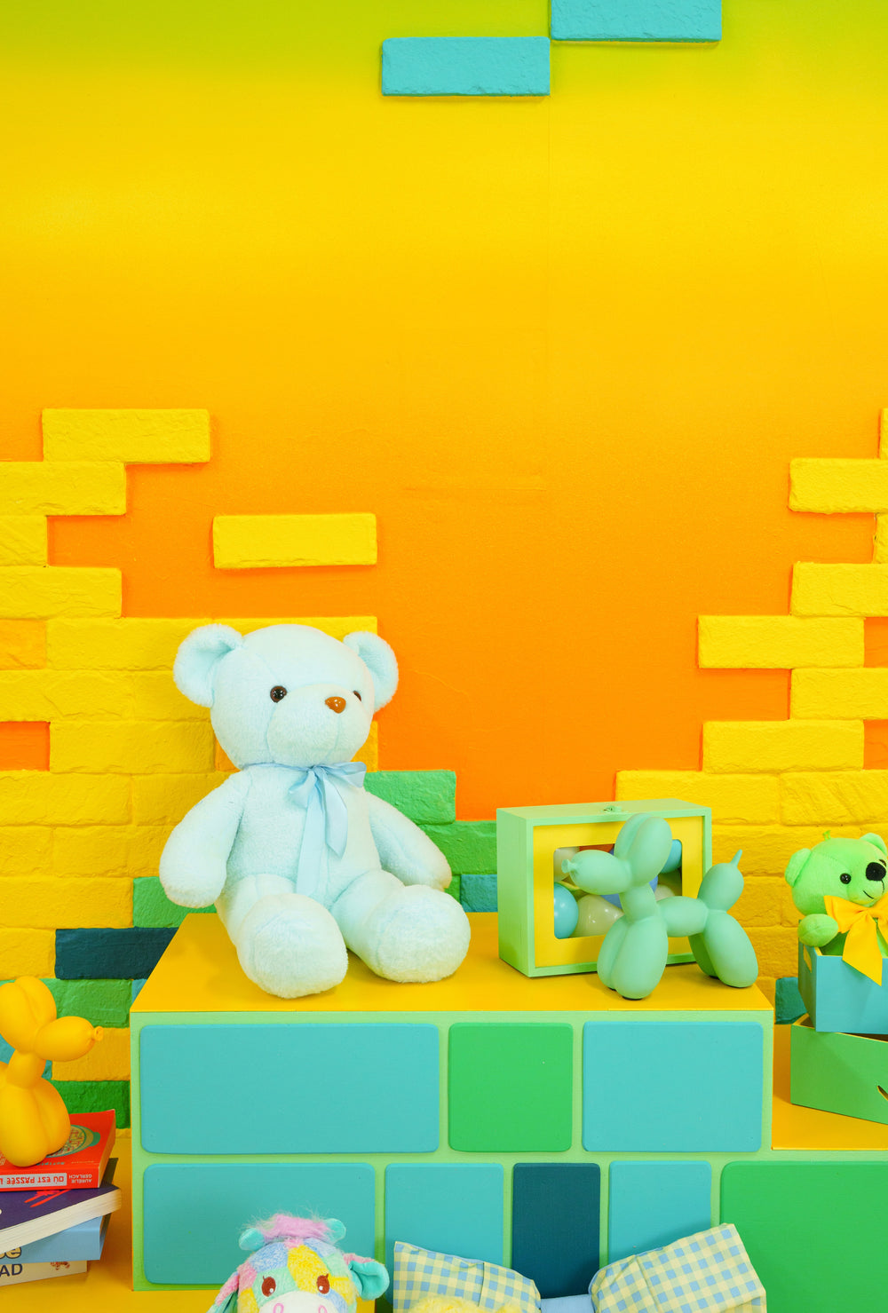 デザイン違いの壁にポップなカラーが映えるキュートなスタジオとなっており、ポップな7色に塗り分けられたカラフルな壁が印象的です。カラフルな床も含めインパクトのある空間に背景の色に馴染むカラーの椅子と机も用意がございます。