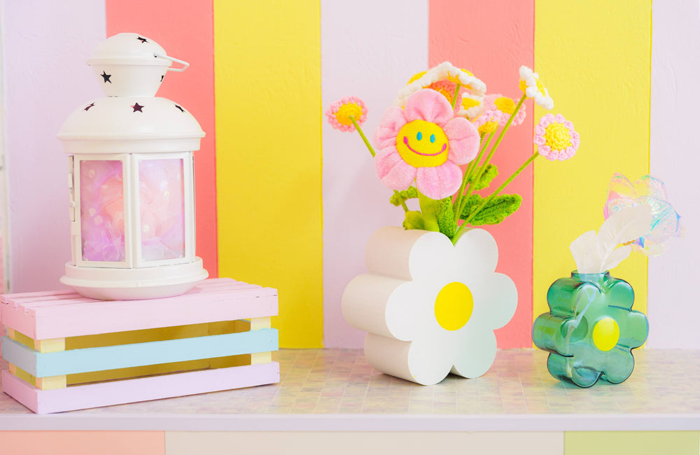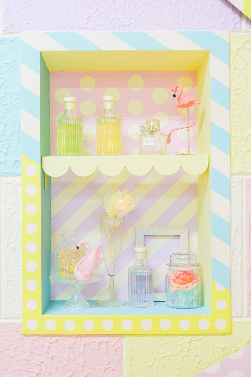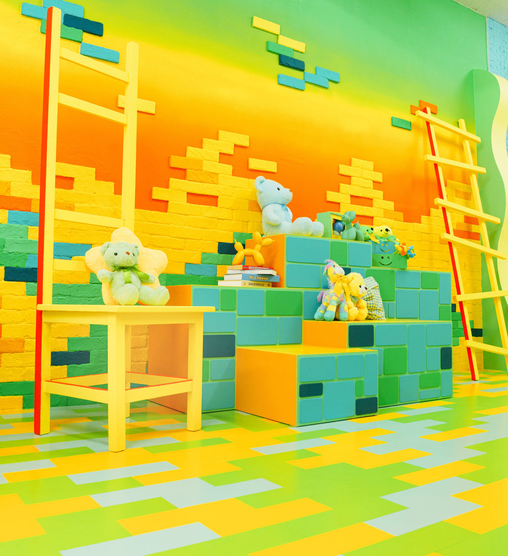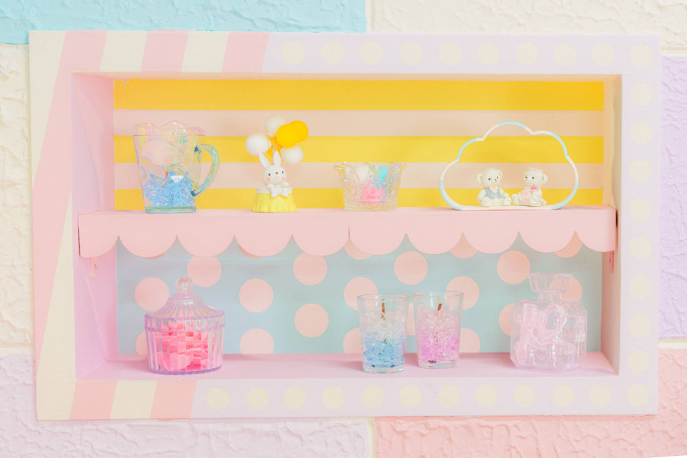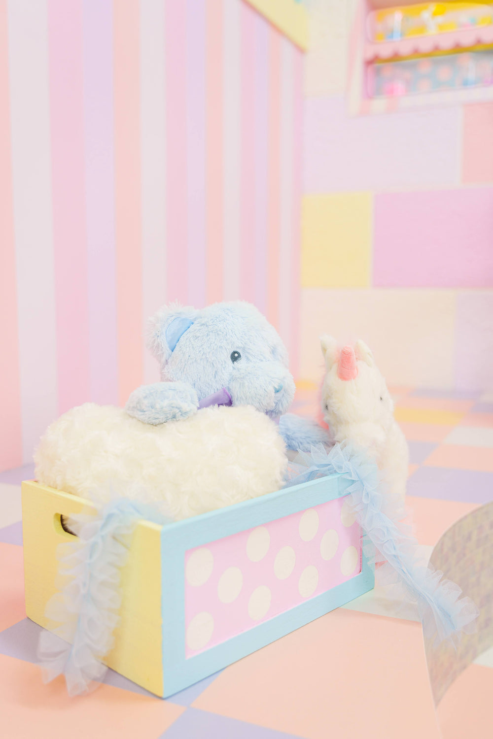 デザイン違いの壁にポップなカラーが映えるキュートなスタジオとなっており、ポップな7色に塗り分けられたカラフルな壁が印象的です。カラフルな床も含めインパクトのある空間に背景の色に馴染むカラーの椅子と机も用意がございます。