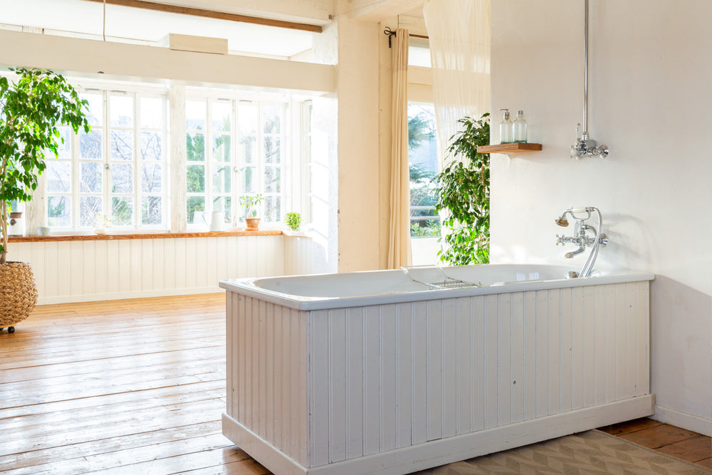 2Fは飴色に輝くアンティーク床と格子窓が印象的で、南向きの窓からやわらかな光が差し込み、落ち着いたクラシカルな雰囲気を演出。バスタブやテラスを背景にしたユニークなカットも可能です。